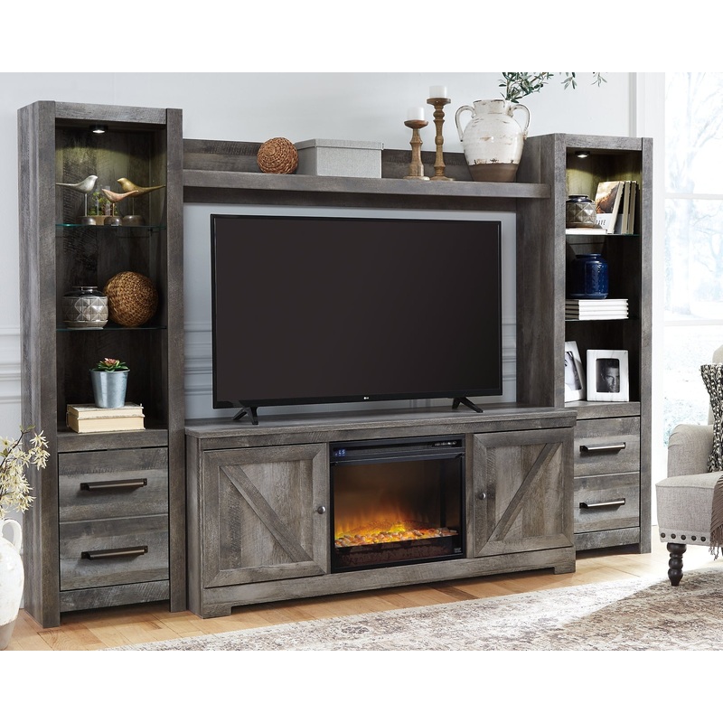 | Details | Includes TV stand, 2 lighted piers, bridge and electric fireplace insert (W100-101), Made with engineered wood (MDF/particleboard), Rustic gray finish over replicated oak grain with plank effect, TV stand with 2 storage cabinets (each with an adjustable shelf) and removable/adjustable center shelf, Each pier has 2 glass shelves and cabinet door revealing single-shelf storage; overhead LED lighting; reversible cabinet doors and can open left or right with consumer assembly modification, Cutouts for wire management and ventilation, Electric fireplace insert provides up to 5,386 BTU/1,500W and warms up to 1,000 square feet (heats larger rooms), 7-level temperature setting; 5 levels of flame brightness, LED-lit multi flame display operates with or without infrared heat; realistic-looking log set with dynamic glowing embers, Remote control with LED display, Timer function with programmable ranges from 10 minutes to 9 hours; overheating control device, Power cord included; UL Listed, Assembly required; simply remove the center shelf and back panel to make room for the fireplace insert |