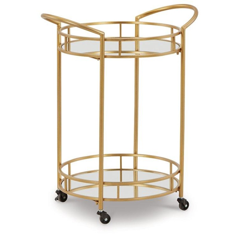Add a bright spot to your contemporary space with this bar cart. Its beautifully bold blend of goldtone metal and mirrored glass heightens your home’s modern aesthetic. Its a striking choice for your kitchen or entryway, with locking casters allowing you to serve in style whenever and wherever it’s needed.