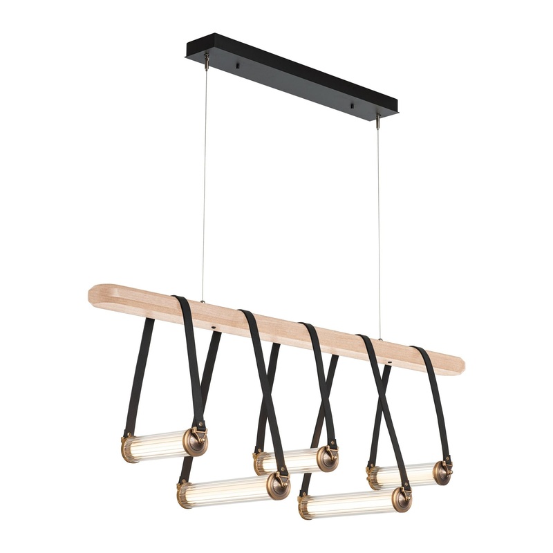 York Linear 5-Light LED Pendant Black Antique Brass with Black Leather Maple Wood