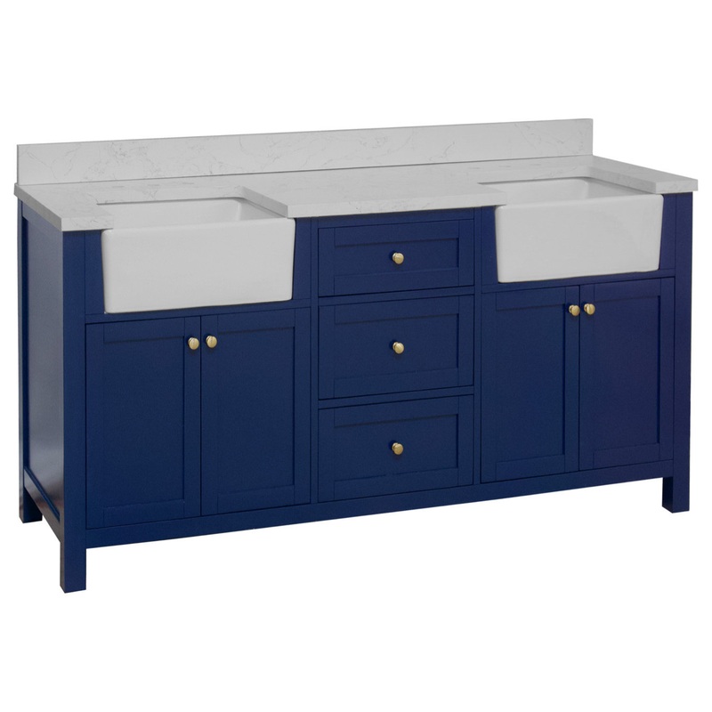 The Yorkshire: Clean and versatile, the Yorkshire bathroom vanity combines farmhouse charm with modern-day functionality. The stunning countertop is designed for those who love the look of natural marble but prefer the lower maintenance of engineered stone.