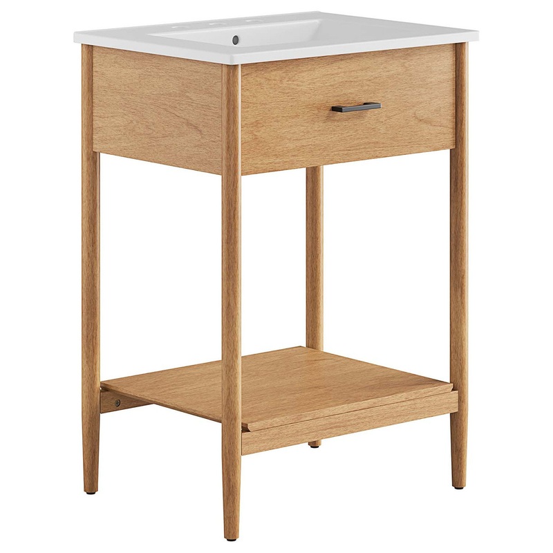 Infuse your bathroom decor with the subtle charm and simplicity of the Zaire 24 Bathroom Vanity. This exquisite washstand combines sleek, contemporary lines with the natural beauty of wood in an organic minimalist design. Crafted from MDF and solid rubberwood and topped with a wood grain veneer, this vanitys design is emphasized by a metal handle pull on its fixed drawer, giving it a touch of urban chic. Below this, you’ll find an open shelf, ideal for holding towels or showcasing your favorite decorative pieces. Featuring a sleek ceramic basin with 8″ centerset holes and an integrated countertop, this vanity easily becomes a functional centerpiece in your bathroom. This vanitys tapered wood legs are a modest and understated design choice that completes the overall simple mid-century aesthetic. Includes adjustable, non-marking feet for added stability and floor protection. Assembly required. Fixtures not included. Weight Capacity: 275 lbs.