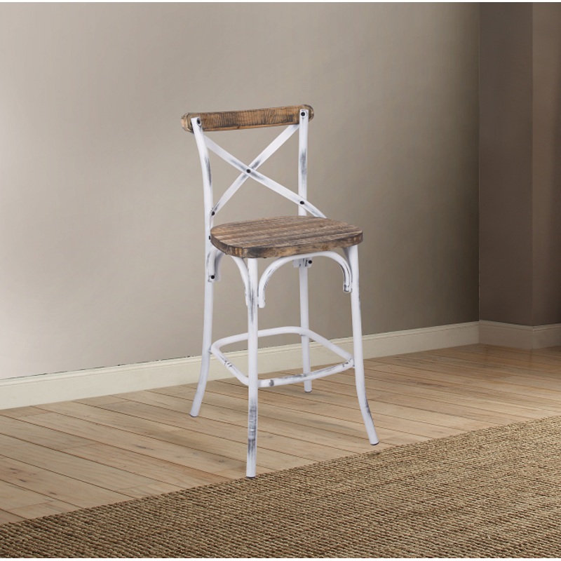 ACME Zaire Bar Chair (1Pc), Antique White & Antique Oak, 29" Seat Height, 43"H, 29" Seat Height, 17lbs. The Zaire collection chairs offer a vintage style inspired by Parisian Bistros chairs. Features: reclaimed wood and metal looks, simple "X" style backre
