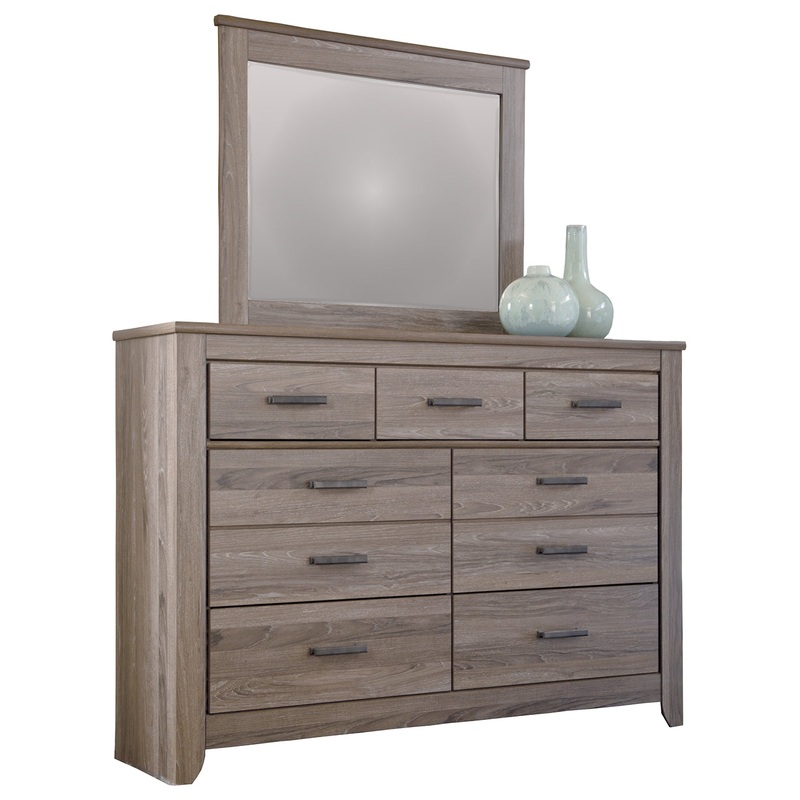 Urban sophistication with a decidedly relaxed air. If effortless elegance is the impression youre going for, this dresser and mirror set is custom made to fit your space. Its got the crisp, clean lines of a contemporary piece, but with softly weathered elements, including antiqued industrial pulls and an earthy finish that lets the beauty of replicated oak grain flow through. Seven smooth-gliding drawers of varied size make it a bedroom essential.