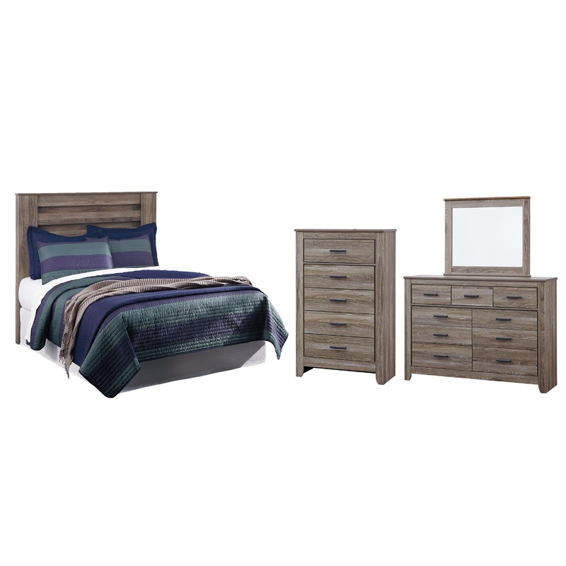 Zelen Full Panel Headboard Bed with Mirrored Dresser, Chest and Nightstand
