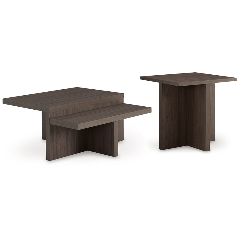 With its geometric allure, this table set serves as a striking focal point for casual or refined settings. Its clean lines and rich dark brown wood-grain finish create a warm and inviting atmosphere of natural beauty. Seamlessly blending with unpretentious lifestyle interiors, these tables offer distinctiveness and functionality.