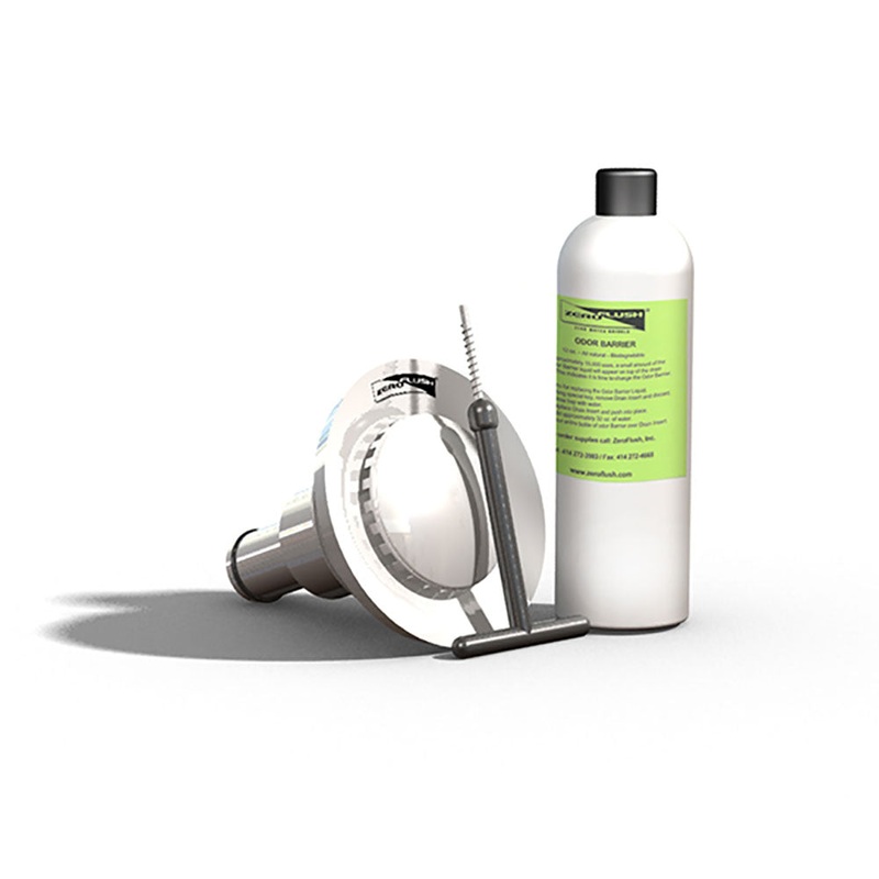 The ZeroFlush Drain Insert Replacement Kit comes in a case of two and is made with 100% recyclable ABS plastic. It includes a urinal drain insert, drain insert key and a 12 oz. bottle of 100% natural and biodegradable Odor Barrier Liquid for use with the ZeroFlush Waterless Urinal.