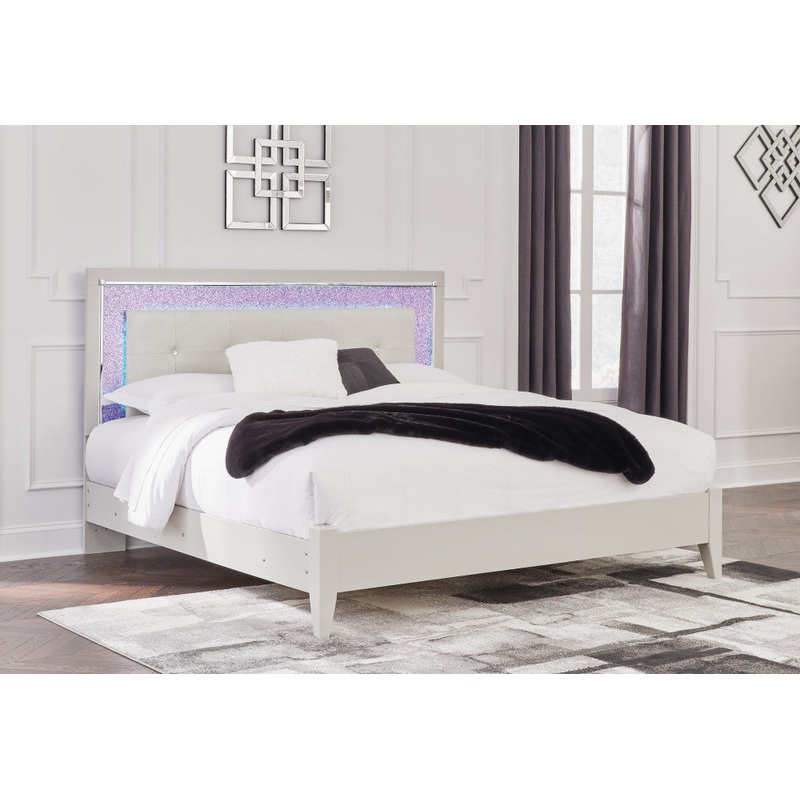 Details Includes upholstered panel headboard and panel footboard with rails, Made with engineered wood (MDF/particleboard/plywood) and decorative laminate for the right balance of affordability and durability, Silvertone pearl finished faux gator, Decorative laminate replicates natural or man-made material surfaces with consistent color, pattern and texture, Headboard with faceted chrome-tone details, faux crystal tufted silver upholstery with faux alligator effect and glitter inlays, Headboard includes LED lighting with remote for color and brightness options; included holder discreetly keeps remote accessible, Foundation/box spring required, sold separately, Mattress available, sold separately, Minor assembly required